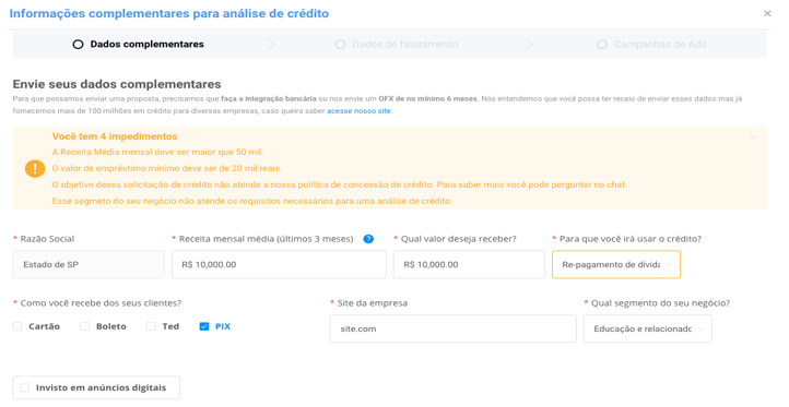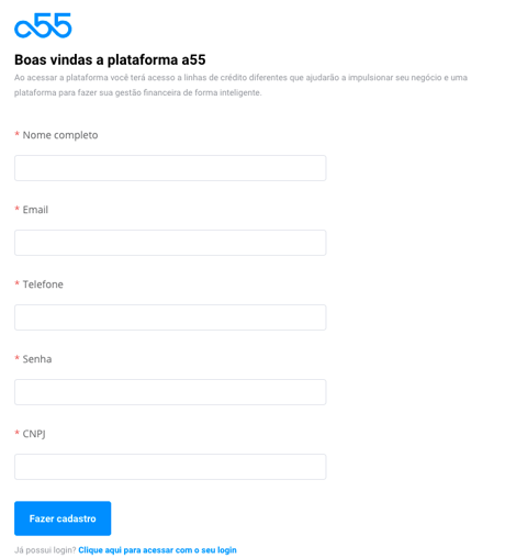 "A a55 é a primeira Fintech brasileira com linhas de crédito 100% focadas em e-Commerce. Nós ajudamos empreendedores a acelerarem o crescimento de suas empresas, dando acesso a capital de forma rápida, simples e com ótimas taxas. Nossas soluções são para empresas que precisam de Crédito para acelerar seu crescimento Capital de giro e financiamento de estoque Linha de crédito específica para investimento em marketing digital Não exigimos garantia real e também não vamos te pedir uma porção de documentos. Nossa análise de crédito é baseada no histórico transacional da sua loja. Para solicitar uma proposta, cadastre sua empresa na Plataforma a55. "