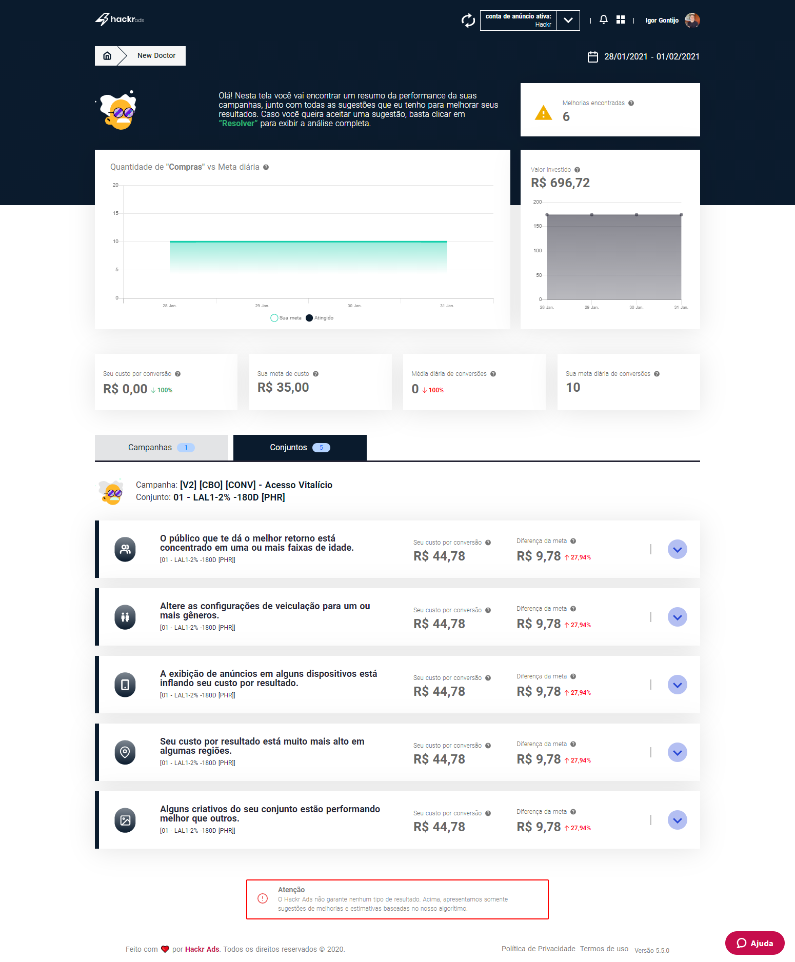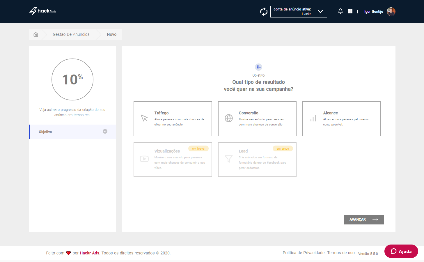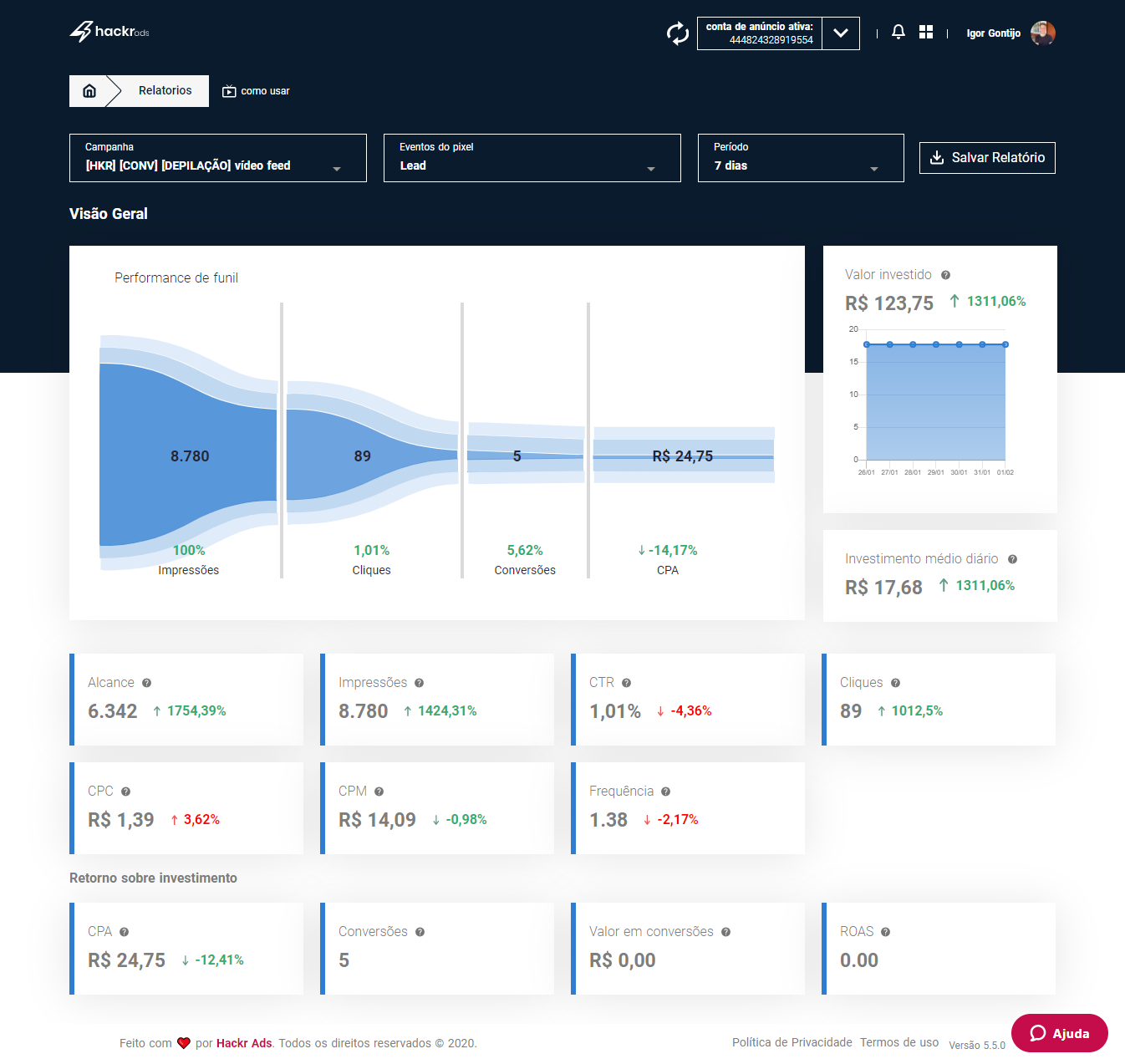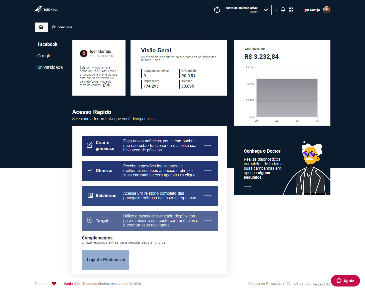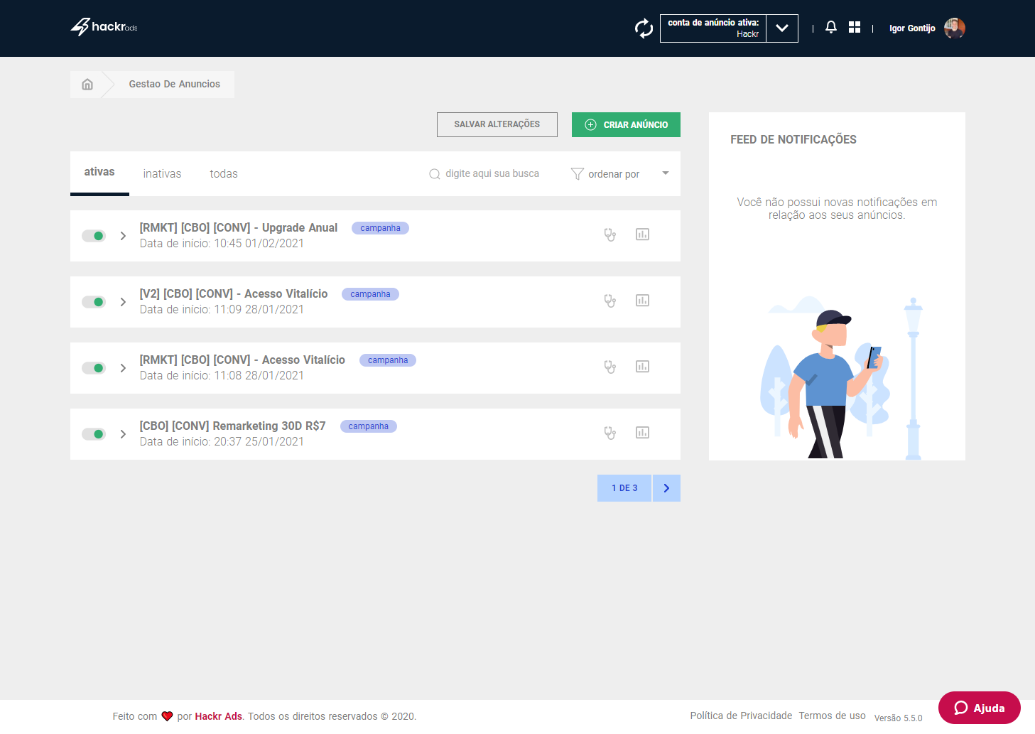 Com o Hackr Ads você anuncia os produtos da sua loja no Facebook e no Instagram, de forma profissional, mesmo que você não tenha experiência com anúncios. A ferramenta foi criada para fazer lojistas como você terem lucro anunciando produtos através da internet. Nossa tecnologia inteligente, faz uma análise completa dos seus anúncios e sugere melhorias que podem ser aplicadas com apenas um clique. Além disso, o Hackr Ads gera relatórios completos dos seus anúncios e permite que você crie as suas campanhas por dentro da plataforma, num passo a passo simples, criado especialmente para quem está começando com anúncios online. Comece hoje mesmo o teste de 30 dias do Hackr Ads por apenas 7 reais e crie ainda hoje a vender com anúncios na internet.
